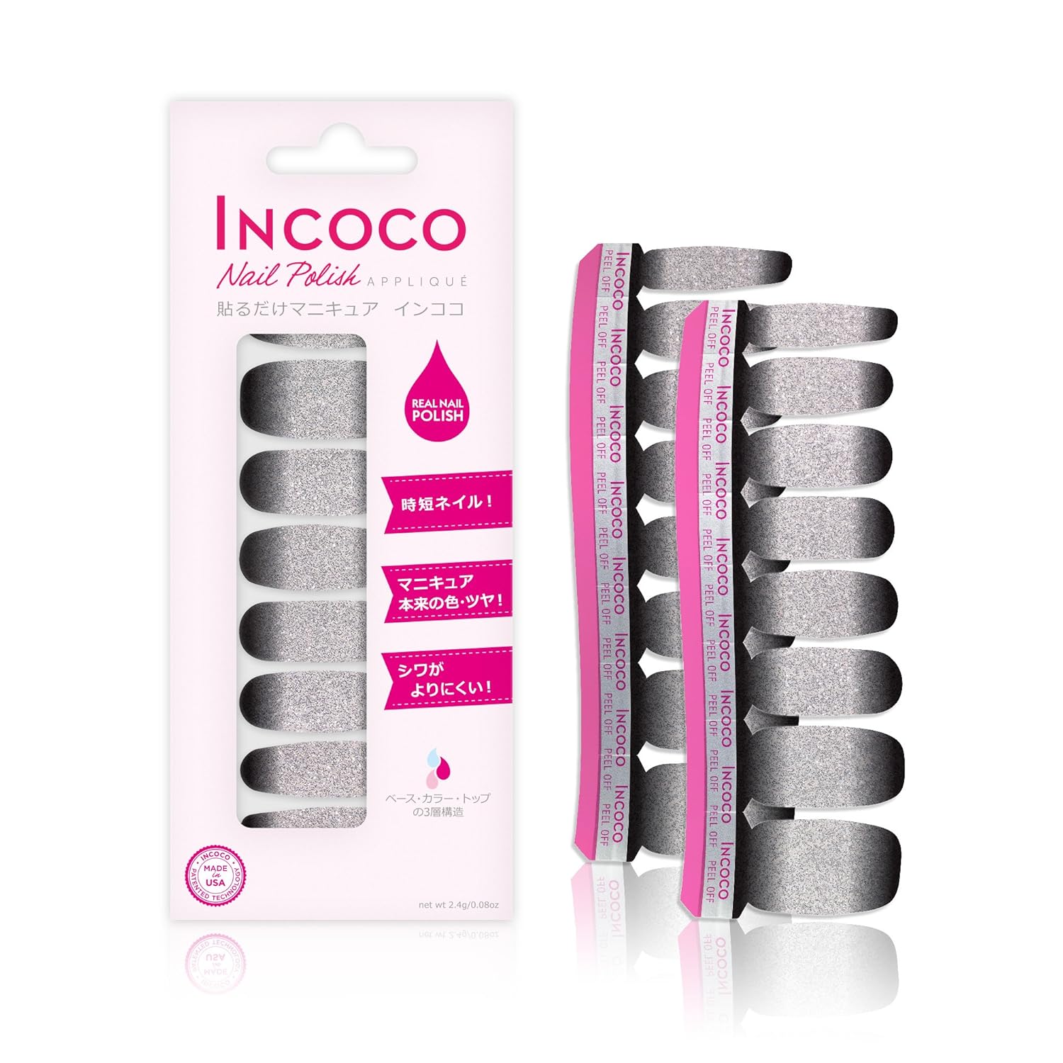 アメリカ生まれの貼るだけマニキュア 「インココ・ネイル・ポリッシュ・アップリケ」(Incoco)はマニキュア成分でできたシートタイプのマニキュアです。乾かす時間不要、塗りムラ知らず、且つマニキュアならではの発色やツヤを楽しめます。インココでまったく新しいマニキュア体験をしてみませんか!【数量限定】シルバーグリッターベースにグレーのグラデーションネイル。INCOCOが贈る新作のグラデーションネイルは神秘的なグレー!実はシックでとても上品な指先になります!