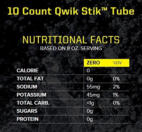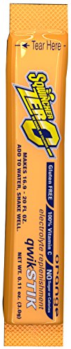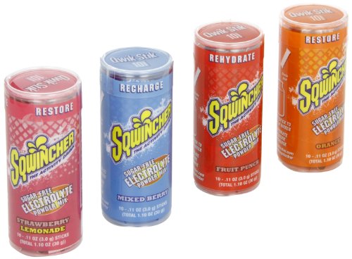 The Sqwincher 060119-AS lite Qwik Stik electrolyte replacement powdered beverage mix is a 0.11 oz. package of sugar-free powdered sports beverage concentrate, assorted flavors, that mixes with water to make 20 oz. of electrolyte beverage to help replenish fluids and electrolytes lost during physical work, exercise, or illness, or following exposure to extreme heat. Each package is designed to be mixed with a 20-oz. size of bottled water for portability. The concentrate contains no sugar or calories, and comes in an assortment of flavors including orange, strawberry lemonade, mixed berry, and fruit punch. Each tube contains 10 packages.