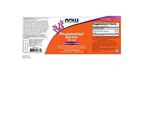 ReleaseDate : 2008-02-08 Studio : Now Foods Publisher : Now Foods Binding : Health and Beauty Product Description NOW Phosphatidyl Serine is a phospholipid compound derived from soy lecithin that plays an essential role in cell membrane composition and intercellular communication. Phosphatidyl Serine is a major structural component of neural membranes where it assists in the conduction of electrical impulses and facilitates the activity of neurotransmitters involved in learning, memory, and mood. 0