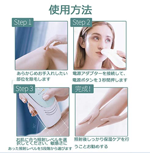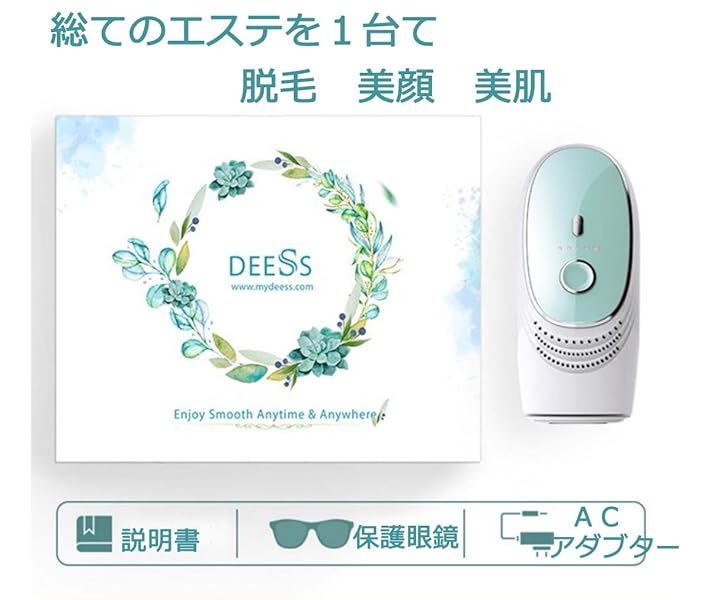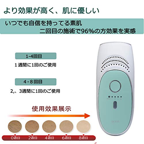 【事前準備】 1:肌の確認:脱毛部分は傷やほくろがないこと、肌の本来の色が黒色では使用できません、日本人や中国人、アメリカ人などの浅い肌色に対応。濃い肌色は火傷になる恐れがあります。 2:照射テストをオススメ:最初は腕の手の甲に試して照射します、少し肌が赤くなるのが正常状況です。5日後赤い肌が元に戻ります。照射テストで痛みが強烈、発疹が5日後も恢復しない場合、お使用をよししてください。試しの照射結果により、使用できるのかを決めます。(詳しい照射方法は下の使用方法を参考してください) 3:脱毛工具と脱毛プランを作り:単部位が照射され過ぎることと照射漏れを回避するため、脱毛プランを作って毎回の実際脱毛状況を記載する必要があります。脱毛の実施日、実施部位など。 【具体的な使用方法】: 1:脱毛部位の清潔作業:脱毛の前に、脱毛部位のむだ毛をシェーバーで短く切って(伸びた毛が邪魔になり十分照射できない場合があります)、石鹸や水で清潔します。皮膚を乾かします、氷や保冷剤で脱毛部位を冷やします。 2:電源を入れます:付属のACアダプターを脱毛器の電源ポートに繋いでから、コンセントに挿します。機械上の電源ボタンを押します、電源指示灯が緑になり。 3:レーザーレベル設定:レーザーレベルが4段階調節できます、各部位、各肌タイプに対応できます。 初回の使用はレベル1から使用してください。 レベル1: 1番目のライトが点灯 レベル2: 2番目のライトが点滅 レベル3: 3番目のライトが点灯 レベル4: 4番目のライトが点滅 4:照射専用メガネをつけます。(付属されております) 5:照射(腕の脱毛を例として紹介、ほかの部位が同じやり方) 腕の脱毛範囲の上から照射始めます。照射口をしっかりと直角で肌にあてます。(肌にあててランプが点滅します。準備が出来ていないとランプはつかないです、肌にあたらないと点滅しませんのでわかりやすいです。) 発射ボタンを一回押します。発射後、脱毛器を下の方に少し移動します。先とおなじ、発射します。(注意:2回の発射は発射間隔時間は最少8秒)このように上から下まで、腕の脱毛をします。一番下の照射が終わりましたら、ここで10分休憩、10分後、下から上まで、腕の照射を行います。(おなじ照射部分は少なくても10間隔で次の照射できます)繰り返して2回やります。(肌の状況により、上から下まで一回だけでもOKです) 6:使用後のお手入れ:ティッシュで照射口や本体、メガネなど使用した物を拭いてください。元の包装箱に入れて保管してください。(0℃以下の環境で保存しないでください) ※大体8週間以降生えてきたむだ毛が細柔らかくなり、生えてきたスピードも遅くなり、新しいむだ毛が生えてきた時だけ脱毛します。明らかに毛が生きてこなくなり、ツルツルのお肌になりました。 | ※【医療機関でテスト済み】 DEESSは皮膚科医と共に研究開発しました。使用者のテストによって、96%の使用者が「わずか2回のお手入れで効果を実感した」と返事します。ホームケアでも高い満足度を得られます。 ※医療機器ではありません。 |