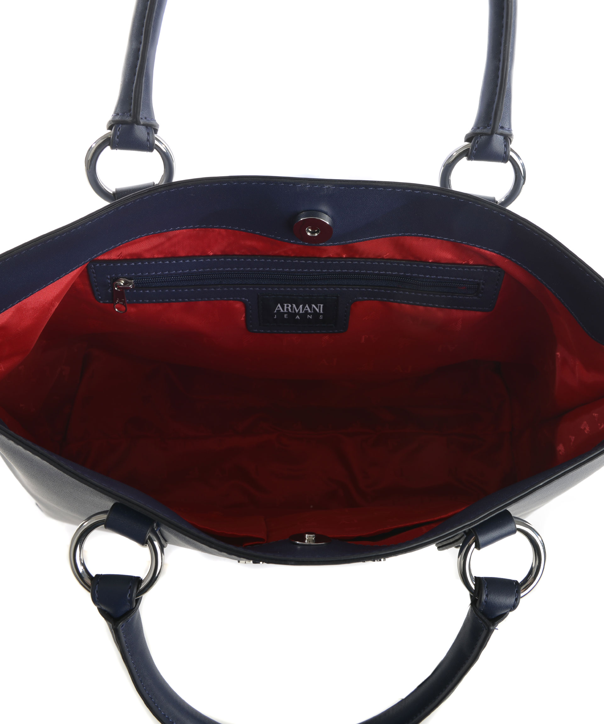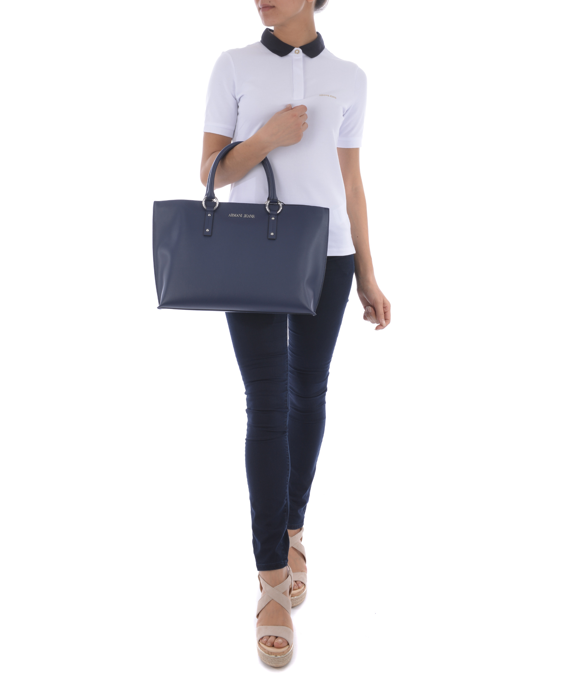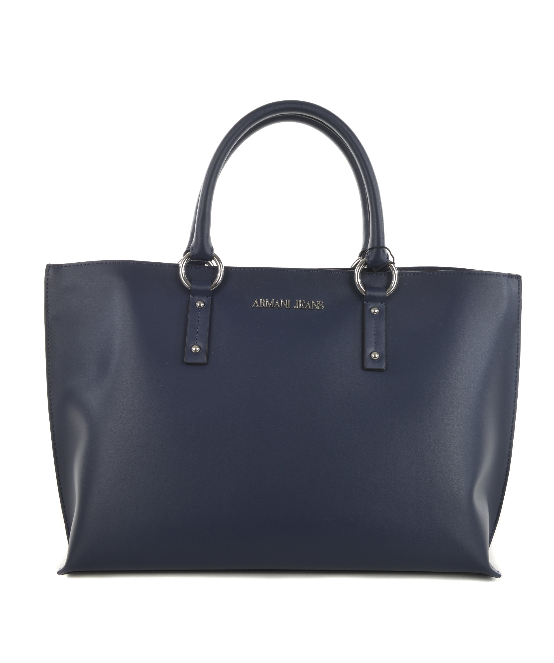 Large Top Handle Tote from Armani Jeans: Blue Large Top Handle Tote with round tope handle, silver-tone logo plaque at front, magnetic top closure, internal pouch pocket and silver-tone hardware.