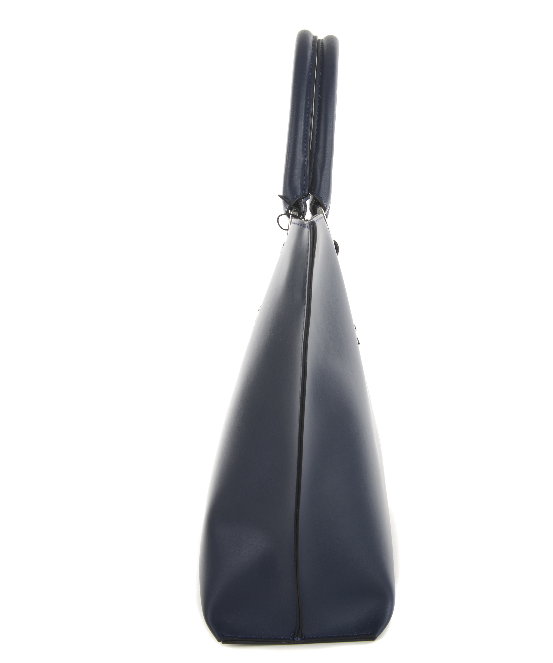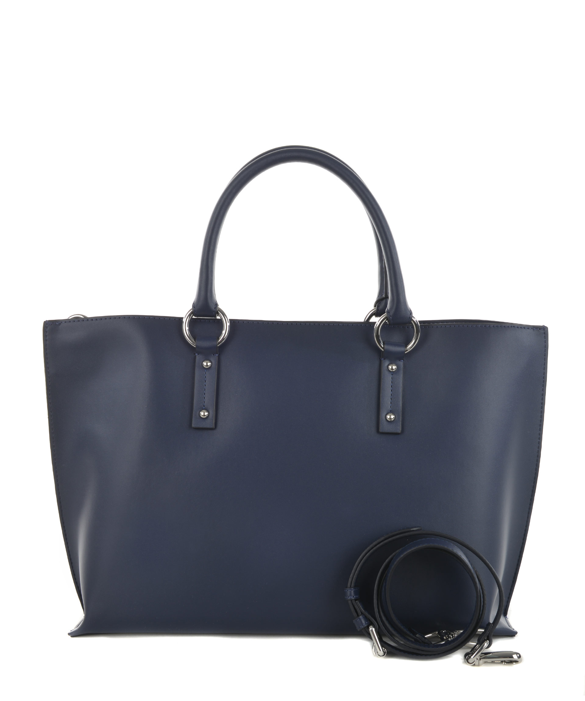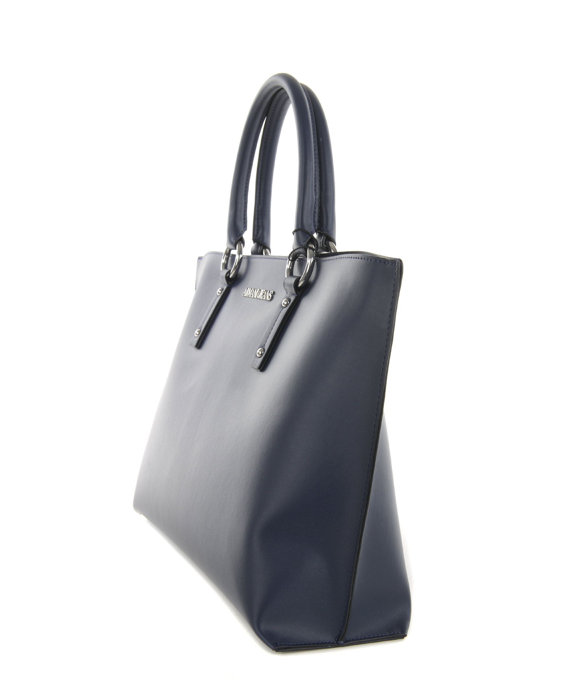 Large Top Handle Tote from Armani Jeans: Blue Large Top Handle Tote with round tope handle, silver-tone logo plaque at front, magnetic top closure, internal pouch pocket and silver-tone hardware.