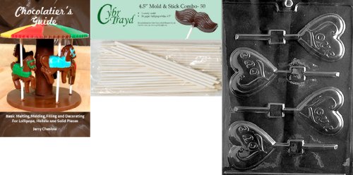 Cybrtrayd 'Love Heart Lolly' Valentine Chocolate Candy Mold with 50 4.5-Inch Lollipop Sticks and Chocolatier's Guide