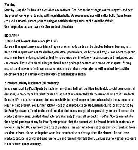 -. LegalDisclaimer : In no event shall Re-Peat Sports be liable for any direct, indirect, punitive, incidental, special consequential damages, to property or life, whatsoever arising out of or connected with the use or misuse of it's products. By its using it's products, you accept full responsibility for any damage or harmful results that may occur as a result of said product. You further acknowledge that all products created, manufactured, or distributed by Re-Peat Sports are offered on the condition that their users accept full responsibility for any ill effects the product(s) may cause. Rare-earth magnets may cause injury: Fingers or other body parts can be pinched between two magnets. Rare-earth magnets are not for children, can affect pacemakers, are brittle and fragile, can affect magnetic media, can become demagnetized at high temperatures, can interfere with compasses and navigation, and can corrode. Those with nickel allergies should avoid prolonged contact with rare-earth magnets. Strong magnets and magnetic fields can cause serious injury or death by interfering with medical devices like pacemakers or can damage electronic devices and magnetic media.