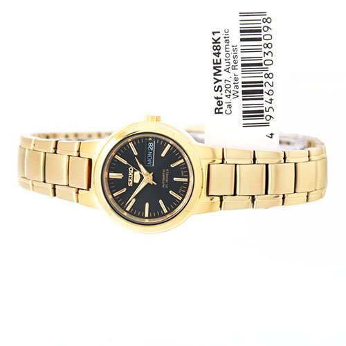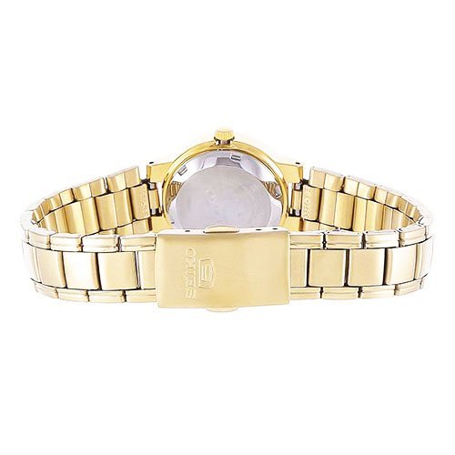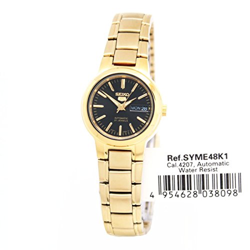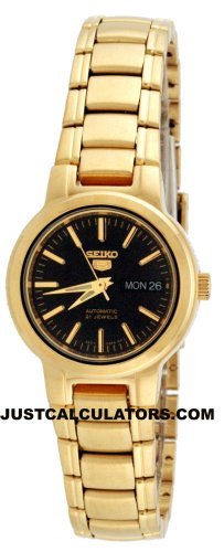 Amazon.com Product Description Brushed and polished gold-toned stainless steel combines with an eco-friendly, classic design in the Seiko Women's Stainless Steel Watch. Sophisticated and refined yet never stuffy, this timepiece boasts 21-jewel Japanese automatic movement for precision and the ease of battery-free operation--to power the watch, simply move your arm. As stylish as it is reliable, this watch features a slender, circular case, black dial, gold-toned hour markers and luminous hands, and an English/Spanish day and date box at three o'clock. A mineral Hardlex crystal joins water-resistance to 99 feet (30 meters) to guard against wear and tear, while a fold-over push-button clasp with safety makes for a secure, comfortable fit. For easy gift-giving and storage, this watch arrives in a Seiko box.