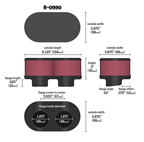 K&N R-0990 Universal Clamp-On Air Filter: Oval Straight; 1.875 in (48 mm) Flange ID; 3 in (76 mm) Height; 6.125 in x 3.875 in (156 mm x 98 mm) Base; 6.125 in x 3.875 in (156 mm x 98 mm) Top