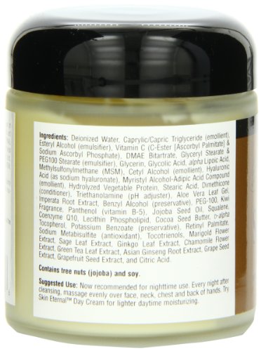 -. Feature : Richly emollient cosmetic that can be smoothed under the eyes or on the neck to nourish delicate skin / Helps your skin feel more supple and replenished / May be used by itself or in conjunction with Skin Eternal¿ Serum / Contains DMAE, alpha-lipoic acid, ascorbyl palmitate (C-ester), Coenzyme Q-10, MSM, and has a fresh kiwi scent / Available in original or glycolic (AHA)-free formula for sensitive skin