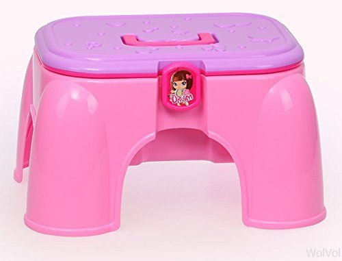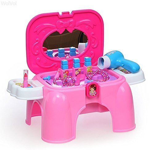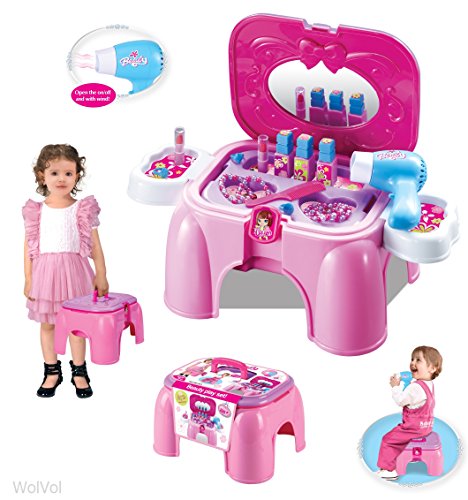 WOLVOL COMPACT CARRY-ON VANITY COSMETIC PLAYSET WITH MIRROR & WORKING HAIR DRYER, FOLDS INTO STEPSTOOL (PINK)
