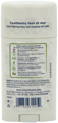 Toms Of Maine Unscented Deodorant Stick, 2.25 Ounce -- 6 per case. Hops inhibit the growth of odor-causing bacteria. The antimicrobial action of hops inhibits the growth of odor-causing bacteria while reducing the possibility of skin irritation. Zinc ricinoleate binds up odor molecules. Sourced from castor beans, zinc ricinoleate traps and absorbs bad smells Natural fragrance blocks odor. Encapsulating natural fragrance oils with silica shells makes them last longer. Kosher and Halal Shelf Life: 999 days 2.25 OunceFeature