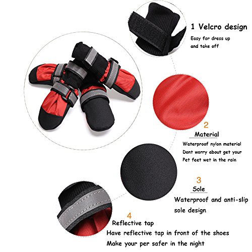 -. Feature : MATERIAL:Nylon fabric+reflective tap+warm fleece. Non-toxic.Not hurt grinding pet foot pain / SAFTETY:Will Keep your Pup's Paws Clean, Dry, and Safe with Protection from Cold, Hot Asphalt, Sharp Objects, Rocks, Wet Surfaces, and So On / WARM: Polar fleece interior is soft, comfortable and warm on a cold snow day / REFLECTIVE:Reflective strip great for night time walking and will help dogs to be seen day or night / SIZE:Note: please measure the paw's size of your dog.Choose the shoes with size a little larger than paw size(around 0.3inch larger)