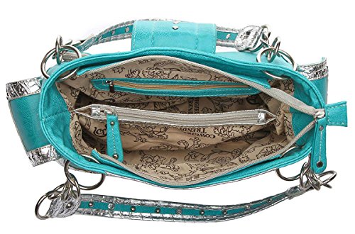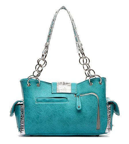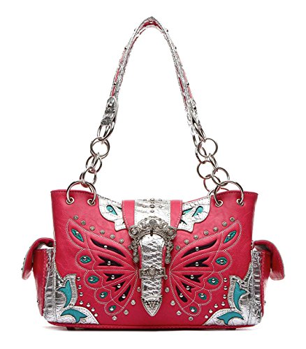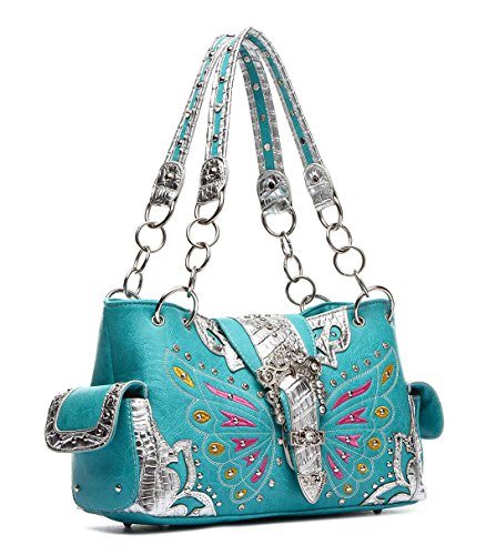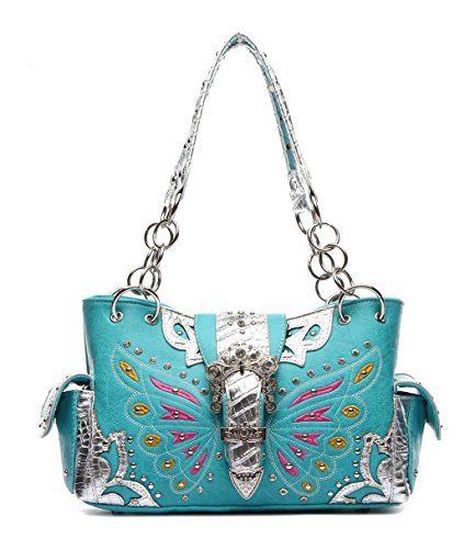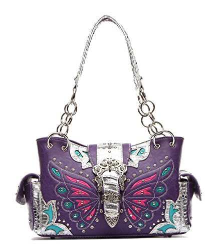 You have a passion for fashion, color and butterflies, and this purse is more than just a stylish fashion statement. This bag packs a powerful punch in more ways than one with its zippered compartment on back for your ccw and open pocket for the accessories. It fits all your essentials, and the pockets inside and out offer you even more space to stash and store your stuff. This vinyl purse is soft, save for the Western style buckle flap covered in sparkly rhinestones, and the studded handles provide a 9 inch drop. This 13 inch long, 8 inch deep, 4.5 inch wide handbag is perfect for those confident ladies with a bold sense of style who are looking for more than just concealment.Feature