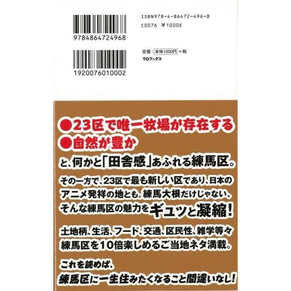 【商品説明】 定価(税込み):1,080円 値引き:10% OFF 東京23区あるあるシリーズ創刊! 「東京の田舎」の異名を持つ練馬区の魅力を怒涛の大放出! 23区で唯一牧場が存在する。自然が豊かと、何かと「田舎感」あふれる練馬区。その一方で、23区で最も新しい区であり、日本のアニメ発祥の地とも。練馬大根だけじゃない、そんな練馬区の魅力をギュッと凝縮! 土地柄、生活、フード、交通、区民性、雑学等々、練馬区を10倍楽しめるご当地ネタ満載。 バーゲンブック 新品 特価 格安 地図 ガイド 目的別ガイド タウンガイド 生活 雑学 アニメ 日本 東京 | |