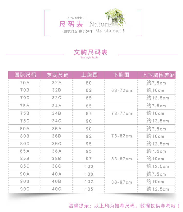此款单件套装=可选,32-38A,32-38B,34C-38C可选。码数怎么选择:您平时穿的内衣的码数,【强烈提示】:【您平时的内衣如果扣在1-2格里面可以拍相同码数,如果扣在3-4格建议拍大一个码数】ABC杯 A杯的碗比较小(适合胸小的),B杯是属于标准的(适合 适中的),C杯是属于比较大的 (适合胸比较丰满的)!内裤都是均码弹性很好的的能穿上内衣的,内裤的都能使用。