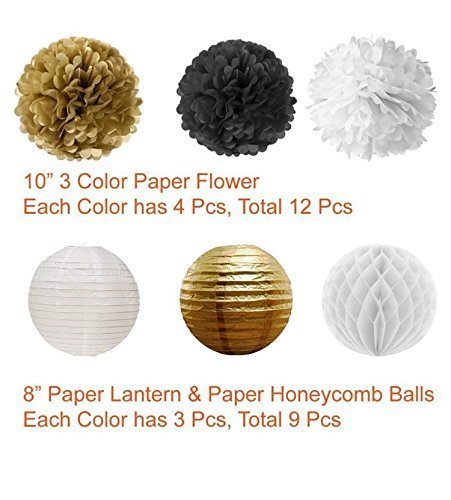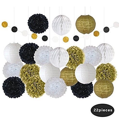 22 Pcs Black White Gold Decorative Paper Lanterns Tissue DIY Pom Poms Paper Flowers Birthday Party Decorations Room Decor Wedding Baby Shower Decorations Outdoor Hanging Decor Decorative Balls By Gari