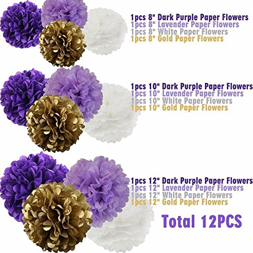 Studio : Wcaro Publisher : Wcaro Binding : Health and Beauty Product Description Notice: The banners need to be assembled by yourself and the paper flowers arrive flat, so you have to individually pull out each side and fluff it up, the package include the instruction and you can go online search for extra instructions (youtube video). Please take note to check if all letters are included when it arrives to avoid any delay. Color: As the pictures shown. (Due to different factors such as lighting or display resolution, it may result in a certain color difference between the product picture and the object.) Package Includes: 13 x Flags Flag Banners(come with 2 x ribbons). 3 x Dark Purple Tissue Paper Pom Poms.(8" 10" 12") 3 x Lavender Tissue Paper Pom Poms.(8" 10" 12") 3 x White Tissue Paper Pom Poms.(8" 10" 12") 3 x Gold Tissue Paper Pom Poms.(8" 10" 12"). 0
