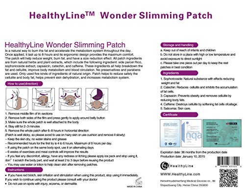-. Binding : Misc. -. Brand : HealthyLine -. Color : Nude -. EAN : 0616906633220 -. Feature : Large size of the applicator covers most of the stomach area with one patch. / Self stick patch - no need to wrap plastic around. Stick and go! You can walk or work with patch on / Same quality as any other best patches on the market. See results in 1 month! / 100% guaranty. If you don't like it - send us a message and we'll take care of it / Please, do not expect instant result on ANY of patches in the world. It takes time. -. IsAdultProduct : 0 -. Label : HealthyLine -. Manufacturer : HealthyLine -. Model : Belly Wing 05 -. MPN : HLBW-05-16 -. PackageQuantity : 5 -. PartNumber : HLBW-05-16 -. ProductGroup : Beauty -. ProductTypeName : BEAUTY -. Publisher : HealthyLine -. Size : 315 mm x 195 mm -. Studio : HealthyLine -. Title : HealthyLine SPA Professional Slimming Belly Body Wrap 5 ps. All Natural contouring self stick patch for Body Detox. Help to reduce cellulite. It works well to tone & firm your skin, and weight loss -. UPC : 616906633220