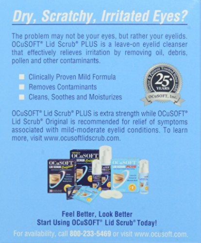 Lid scrub plus formula. Soothes. Relieves irritation. Removes contaminants. Dry, scratchy, irritated eyes? The problem may not be your eyes but rather your eyelids. OCuSOFT Lid Scrub Formulas effectively remove excessive oil, debris, and contaminants that can build up on your eyelids and cause irritation. Lid hygiene can be important to overall ocular health and is often recommended to individuals with dry eyes, blepharitis sufferers, or those preparing for surgery. Feel better, look better. Start using OCuSOFT lid scrub today! Number 1 doctor recommended eyelid cleanser. Scrub plus extra strength formula combines a low-level, proprietary preservative blend that effectively relieves irritation by removing oil, debris and other contaminants. This clinically proven, laboratory tested formula is safe and effective for lid hygiene. Rinse (or leave-on if directed). Proven mild formula; Cleans, moisturizes and refreshes. Convenient, easy-to-use pre-moistened pads.