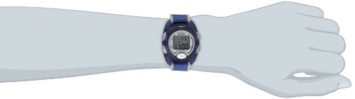 This analog youth watch features a round blue translucent case. Its slip-through strap is made of blue nylon. It also comes with a fun digital graphics and is water-resistant to 30 meters.
