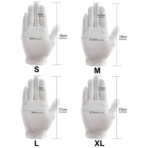 Studio : Sasairy Publisher : Sasairy Product Description Product Details: - Material:Cotton, soft and moisturizing. - Quantity: 12 Pairs. - Size: S/M/L/XL. S: suitable for Palm 16x8cm; M: suitable for Palm 19x8.5cm; L: suitable for Palm 21x9cm; XL: suitable for Palm 23x9.9cm. Features: - Moisturizing: Apply your favorite lotion or cream and then wear the gloves to prolong the effects. - Still suitable for jewelry inspection, electronic operations, precision instrument operations, quarantine work, band work, etc.