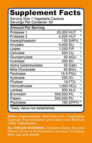 This enzyme supplement contains 18 plant-based enzymes for digestion. The enzyme product helps your body process hard to digest foods from multiple food groups. See images above. Some of the digestive enzymes included are e.g. Bromelain, Amylase, Lipase Papaya and Aspergillopepsin (see full list of ingredients below), which gently and naturally support your digestions by helping break down gluten, triglycerides, fibers, fats & oil lipids in the body. This unique enzyme supplement is one of the most complete enzyme formulas and supports a healthy digestion and digestive process. Each bottle contains 60 enzyme capsules. Made according to GMP Standards. Enjoy your next meal. Order yours today!Feature