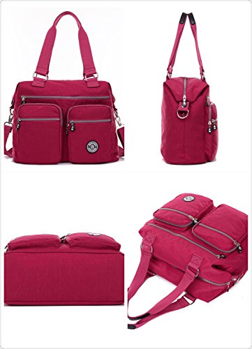 Material: Nylon Weight: 590g Function: handbag, shoulder bag and cross-body bag Internal structure: open pockets for iPad/camera, cell phone pocket, interlayer zipper pocket, pocket for cards, hidden zipper pocket Colors: Black / Blue / Purple / Red Dimension: 15.7inch(L)*6 inch(W)*13.7 inch(H)