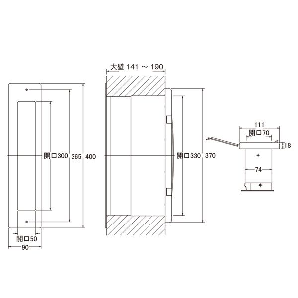 ●スペック:受口部:幅(mm)90 高さ(mm)400 取出し口開口寸法:幅(mm)69 高さ(mm)330 壁厚調整範囲141~190mm