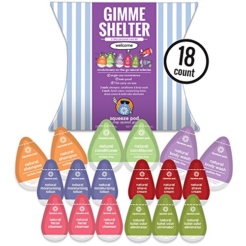 -. Feature : 2 Shampoo, Conditioner, Body Wash & 3 Face Wash, Shave Cream, Moisturizer & Toilet Odor Eliminator / Premium Natural Ingredients - NO sulfates (color-safe), parabens, phthalates, phosphates / Leak-Proof Guarantee - If it leaks, it is FREE! We will replace your product free of charge / TSA-Compliant makes traveling stress free, move easily through TSA checkpoints, carry-on convenient / Proudly Made in USA, PETA Certified Cruelty-Free and Vegan