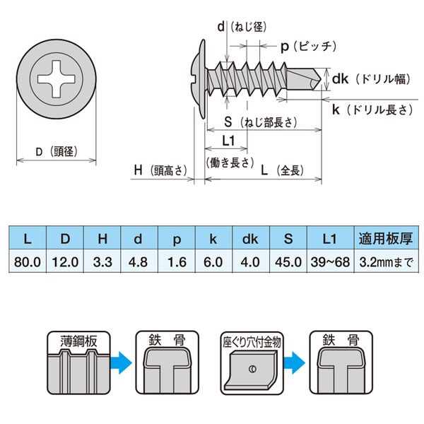 ●薄鋼板+鉄骨用ドリルビス 座ぐり穴付金物+鉄骨用ドリルビス
