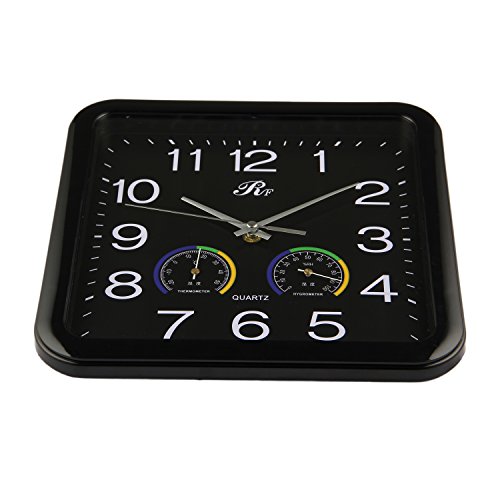 - Feature : Mute quartz movement wall clock; Overall diameter: 12 inch; Weight: 607g / 12 inch square wall clock features a black frame / Frame: plastics; Hands: metal; Dial: PVC / Easy-to-read dial has Arabic numerals, the thermometer and the hygrometer / A fine addition to any office or household