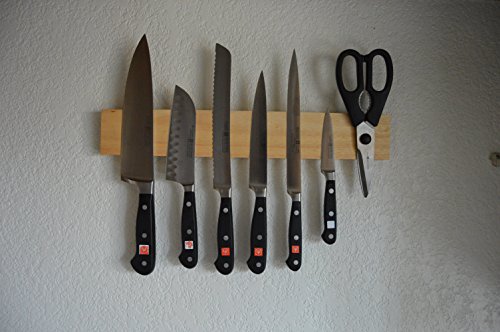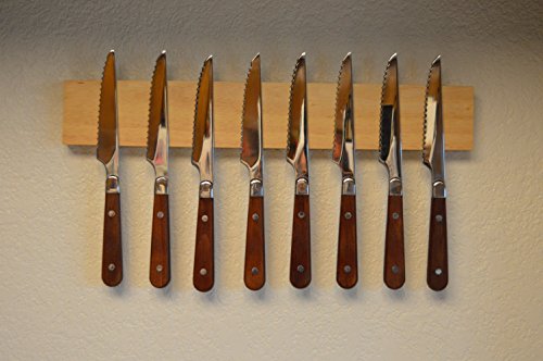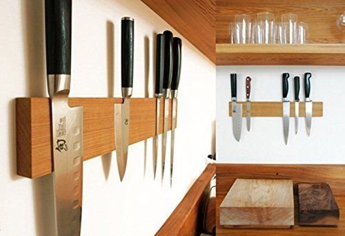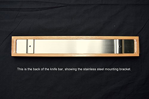 The first picture is how I use my knife bar. It is mounted over my stove top. The magnetic knife and utensil holder saves counter space by hanging your knifes and utensils within easy reach. The magnetic bar is made of solid wood. The color is similar to oak and goes well with most kitchen décor. Two magnet strips run the entire length of the bar, making the entire bar useable. Displays your beautiful knives to be seen by all. The magnetic bar is safer than storing knifes in a drawer. The wood prevents them from being nicked and damaged. The magnetic bar can also be used in the office or garage. The stainless steel mounting bracket hides all screws and mounts the wooden bar securely to the wall. All hardware is included, and it's easy to install. The wood is non-toxic and food safe. If you email me I will send you 10 ideas of where to mount a magnetic knife bar, Packaged in a white gift box. 100% Money Back Guarantee.