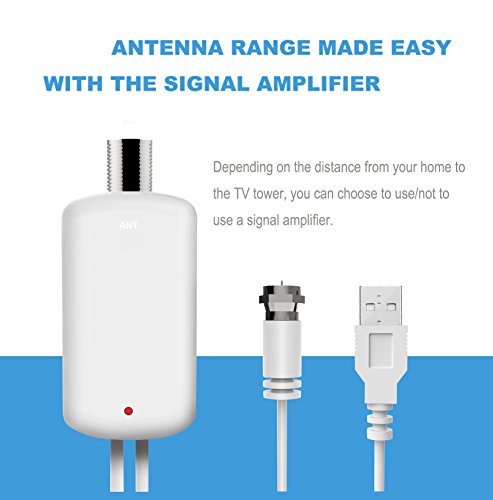 Specifications ? Reception Range: 50 miles ? Size: 9.84*8.85*0.02in ? Signal Booster Cable: 3.28ft ? Antenna Cable: 1.5C-2V / White L=13.12ft ? Compatible with 720p, 1080i, 1080p/ ATSC ? Current Consumption: 20mA ? Operation/ Storage Temperature : -49 ~ 185℉ ? Working Frequency: VHF (172-240 MHz) \ UHF (470-860 MHz) ? Power Supply Connector: USB