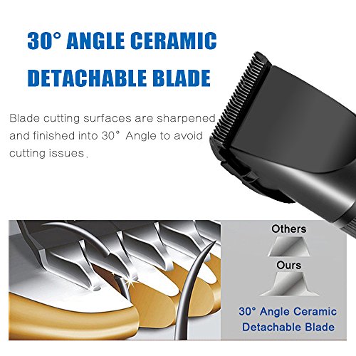 - Titanium blade combining with the ceramic movable blade for efficient and long term cutting and will not get rusty. The "R" shaped rounded edge design of the blade prevents from hurting skin, 30° acute angle blade made the hair clipper more sharp.