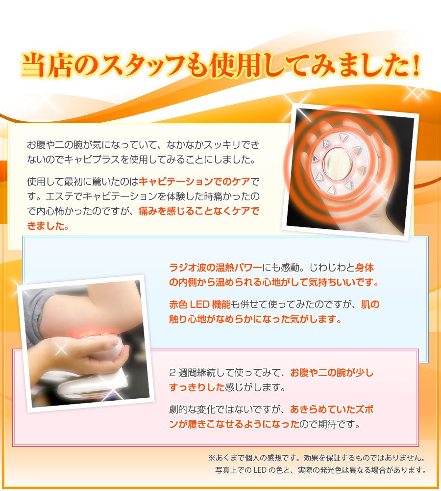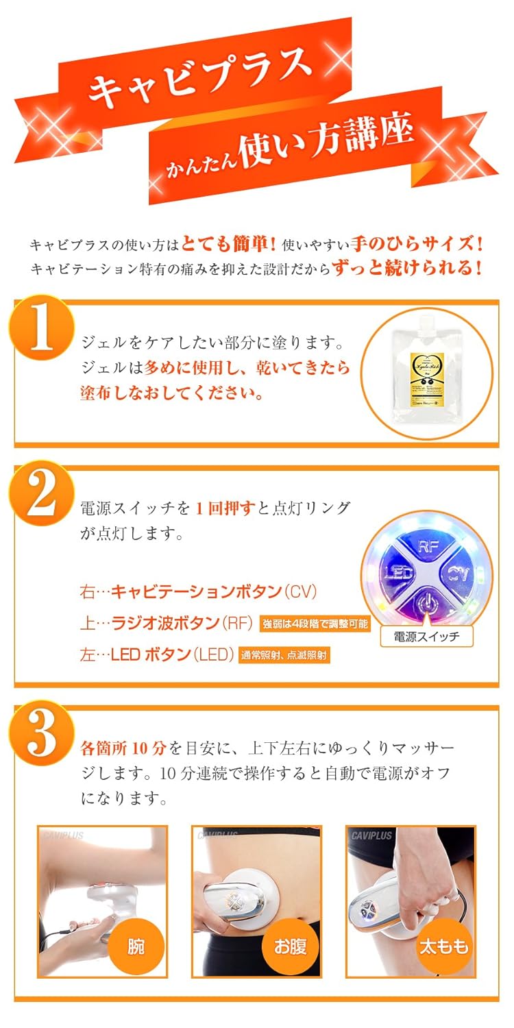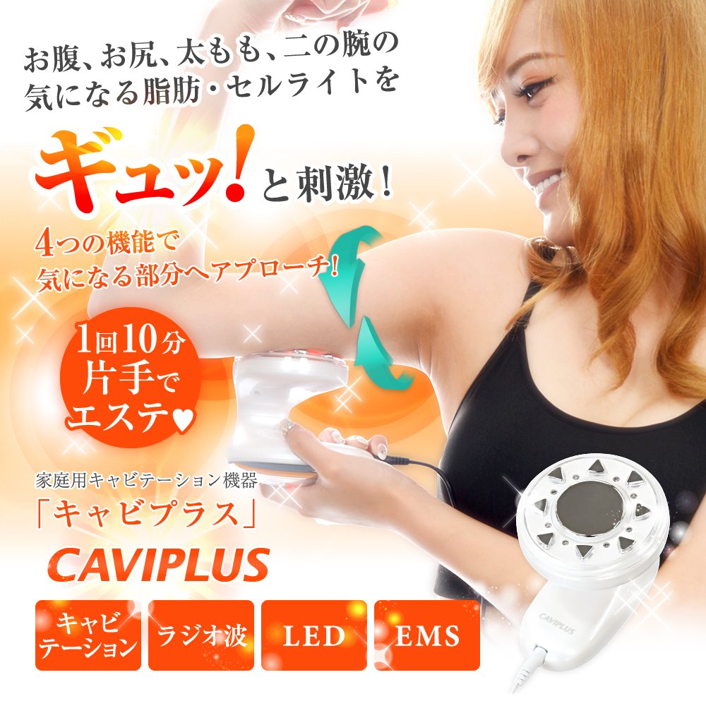 【雑誌・テレビ等メディア掲載多数!】お腹回り・フェイスライン・二の腕・太ももなどの下半身…気になる部分をスッキリ!超音波キャビテーション・高周波ラジオ波・EMS・赤色LEDの4機能が脂肪・セルライトをギュッと刺激!キャビプラスで本気の美ボディ作り、あなたも始めてみませんか?