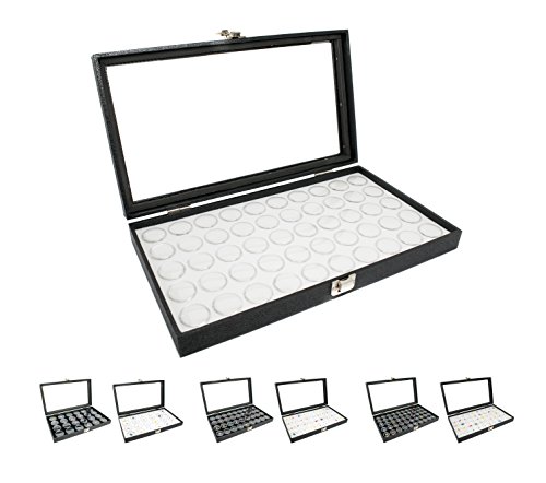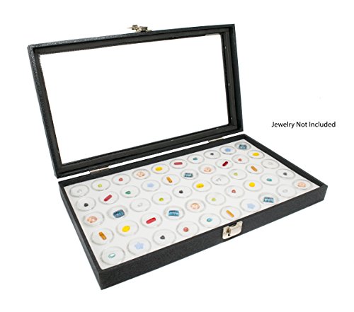 Novel Box® Large Glass Top Black Leatherette Jewelry Display Case + 50 Count Jar Insert Tray in White + Custom NB Pouch