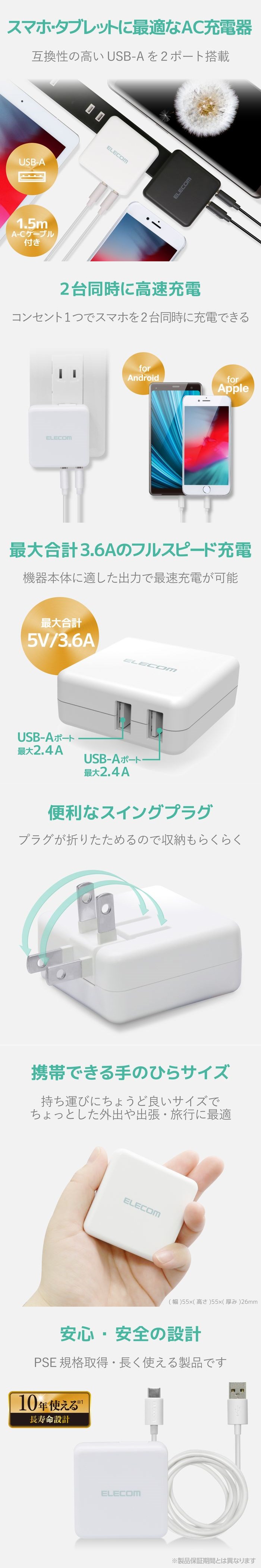 ●合計最大出力3.6Aで、2台のスマートフォンを同時に高速充電できるスマートフォン・タブレット用AC充電器。