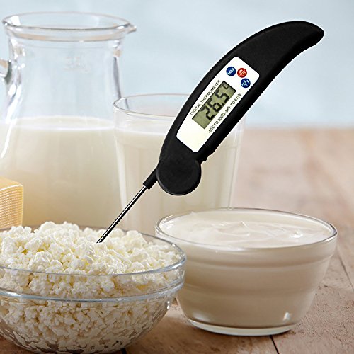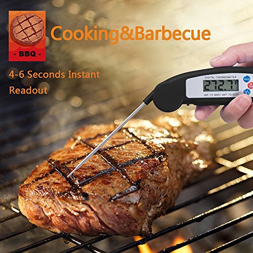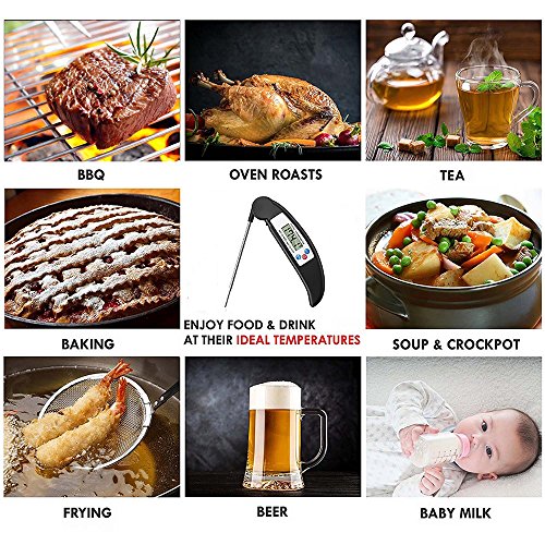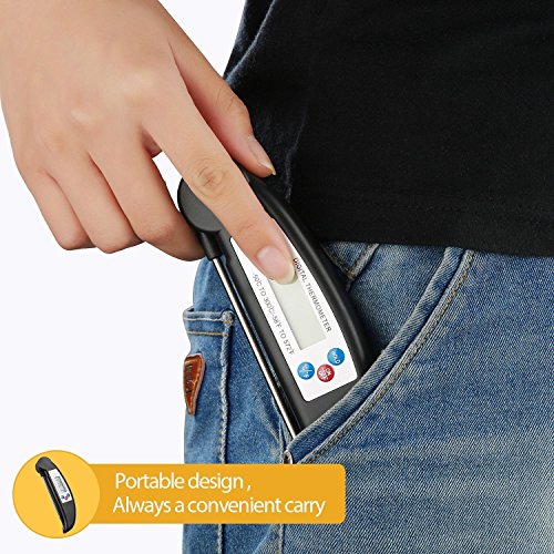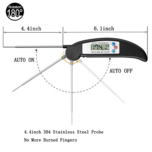 Latest Cooking Thermometers, Zonyee Digital Stainless Cooking Thermometer It's made of food grade stainless steel probe and ABS plastic casing, used for many kinks of foods. Specifications: -℉/℃ switchable - Response Time: 4-6seconds for meat and 4-15 seconds for liquid - Range: -58 ~ 572°F (-50 ~ 300°C) - Battery: 1x AAA 1.5V (Not included) - 10 minutes Auto-off - Food-safe ABS plastic case and stainless probe Operation: 1. To turn on the thermometer, pull the probe away from the thermometer body. The LED screen will turn on, display all option,the display the current probe temperature. To turn off, press the "ON/OFF" button. 2. The thermometer is set to display temperatures in degrees Fahrenheit. To switch to Celsius, press the "℃/℉" button. Saving max temperature records by pressing ℃/℉ key for 6 seconds (MAX button records the maximum temperature). 3.To change the battery, open the case on the reverse side of the thermometer. Replace with an AAA battery.