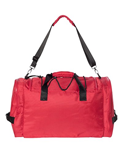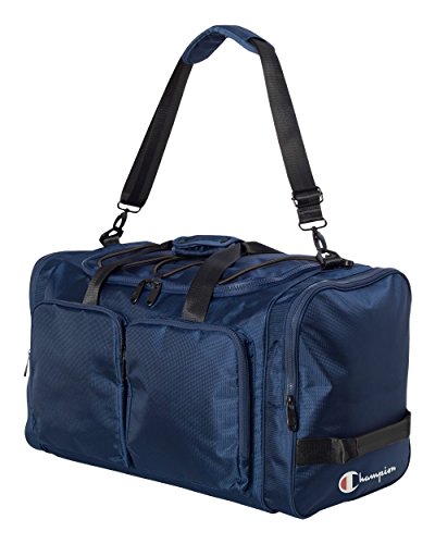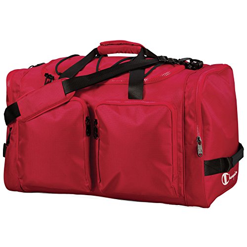 Studio : Champion Publisher : Champion Product Description - 100% polyester - Adjustable, ventilated and removable padded shoulder straps - Carry handle on each end - Large main zippered compartment - Interior zippered pocket - Two small zippered pockets on front - Zippered pocket on both ends - Bungee cord tie down on top - Size: 22" x 13" x 12" 0