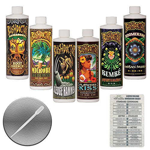 FoxFarm BushDoctor Liquid Nutrient Formula: Kangaroots, Microbe Brew, Sledgehammer, Flowers Kiss, Bembe, Boomerang (Pack of 6 - 16 oz Bottles) 1 Pint Each + Twin Canaries Chart & Pipette