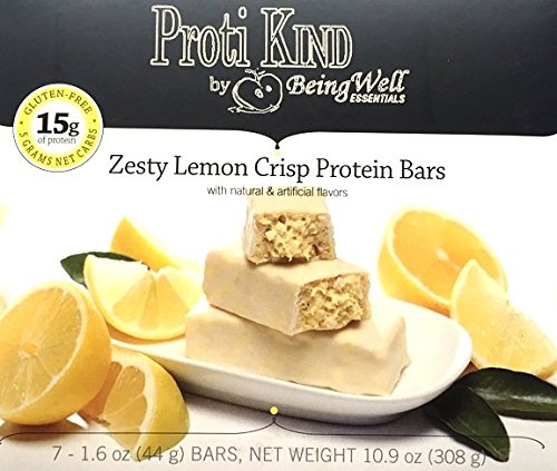 -. Binding : Health and Beauty -. Brand : Being Well Essentials -. Feature : High Protein - 15 grams Per Bar / Low Calorie - 160 Calories Per Bar / Low Fat - 7 grams Per Bar / Low Sugar - 1 gram Per Bar / Identical to popular brand sold in medical weight loss centers -. IsAdultProduct : 0 -. Label : Proti Kind -. Manufacturer : Proti Kind -. MPN : PKZLB -. PackageQuantity : 7 -. PartNumber : PKZLB -. ProductGroup : Health and Beauty -. ProductTypeName : HEALTH_PERSONAL_CARE -. Publisher : Proti Kind -. Studio : Proti Kind -. Title : Proti Kind Zesty Lemon Crisp Protein Bars, 7 Servings, 15g Protein Per Serving
