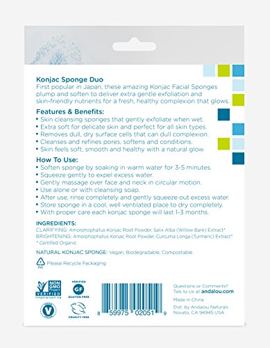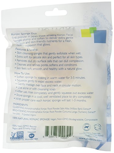 ReleaseDate : 2016-04-01 Studio : Andalou Naturals Publisher : Andalou Naturals Binding : Health and Beauty Product Description First popular in Japan, these amazing Konjac Facial Sponges plump and soften to deliver extra gentle exfoliation and skin-friendly nutrients for a fresh, healthy complexion that glows. Andalou Naturals is the #1 Selling Natural Face Care Brand in the U.S. and the leader in advanced Fruit Stem Cell Science - a portfolio of nature's most potent bioactive for true age defying innovation in every single product. As the first 100% Non-GMO Project Verified beauty brand Andalou Naturals leads the way with label transparency. Our formulas garner results and genuine consumer love with face, body and hair care products that are simply good for you. The meaning of Andalou is 'Path of Light', and we believe it best reflects our intention to foster good things in the world and enrich the lives we touch, one responsible product at a time. We Champion: Certified Organic, Fair-Trade, Gluten-Free, Cruelty-Free, Eco-Friendly, Vegetarian and Vegan ingredients and 100% Non-GMO Project Verified personal care. We Reject: GMO's, Sulfates, Petrochemicals, Phthalates, Artificial Fragrances, Colors and Dyes, Triclosan and Paraben Preservatives. 0