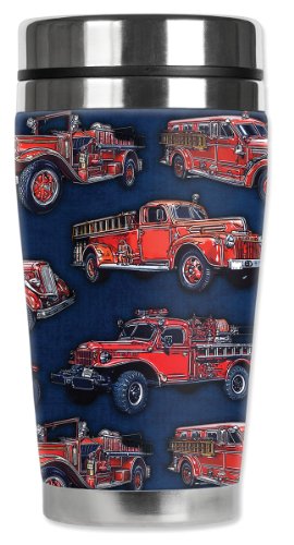 Mugzie Vintage Fire Trucks Travel Mug with Insulated Wetsuit Cover, 16 oz, Multicolor