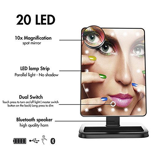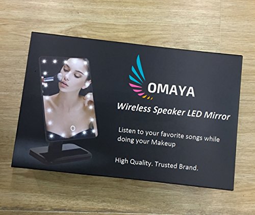 OMAYA Bluetooth Speaker Makeup Mirror- LED Touch Screen wireless Speaker Mirror, Hands Free Speakerphone Cosmetic Mirror, Adjustable Vanity Mirror With 20 LED Light And 10X Magnifier (black)