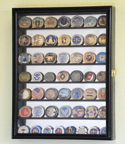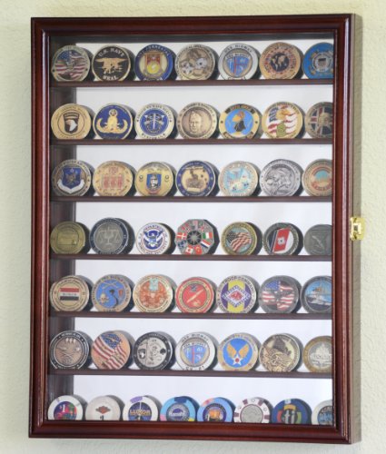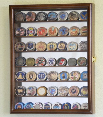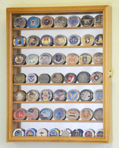 Studio : sfDisplay.com, LLC. Publisher : sfDisplay.com, LLC. Product Description Solid furniture grade beech hardwood military challenge coin display case cabinet of beautiful design and construction is both attractive and affordable. Cabinet features a front door and seven shelves that can display up to 49 standard challenge coins or other coins up to 2" high. Mirror backed provides a stunning reflection for the items you are displaying. Display case comes with brass hinges, a lockable door latch and installed wall hanging brackets. Available in Oak, Cherry, Walnut, or Black (coins are not included). Unit Weight: 6 lbs Outside Dimensions: 18"H X 14"W X 2.50"D Inside Depth: 1 3/4" Space Between Shelves: 2 1/8" Framing Material: Beech Hardwood Door Cover: 98% UV Protection Rated Acrylic Door Hardware: Locking brass latch(s) Background Material: Mirrored back