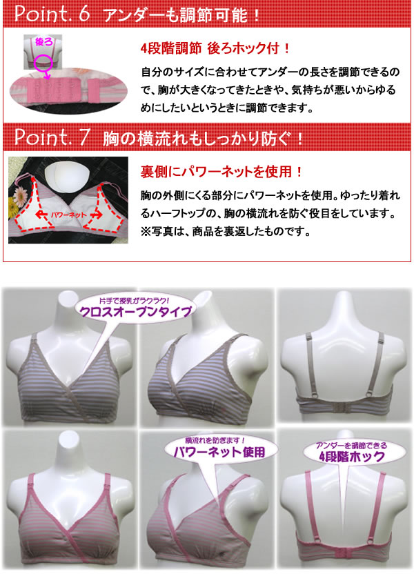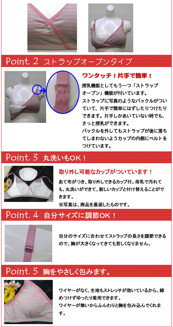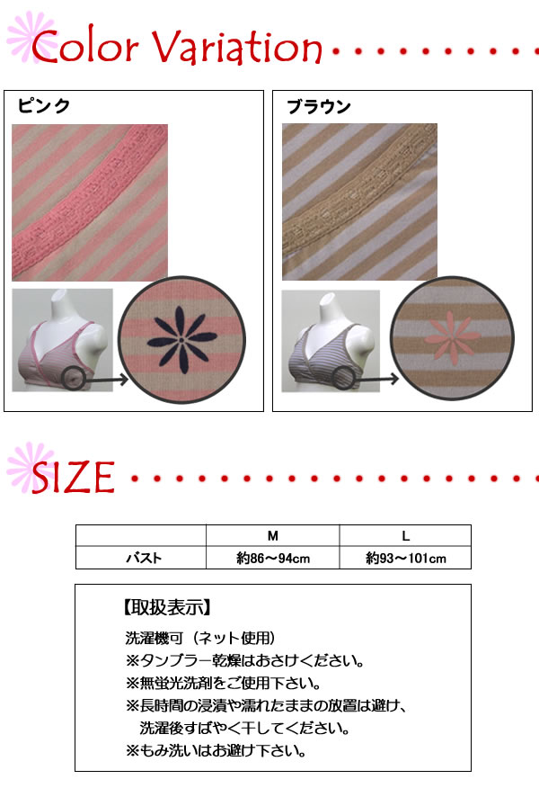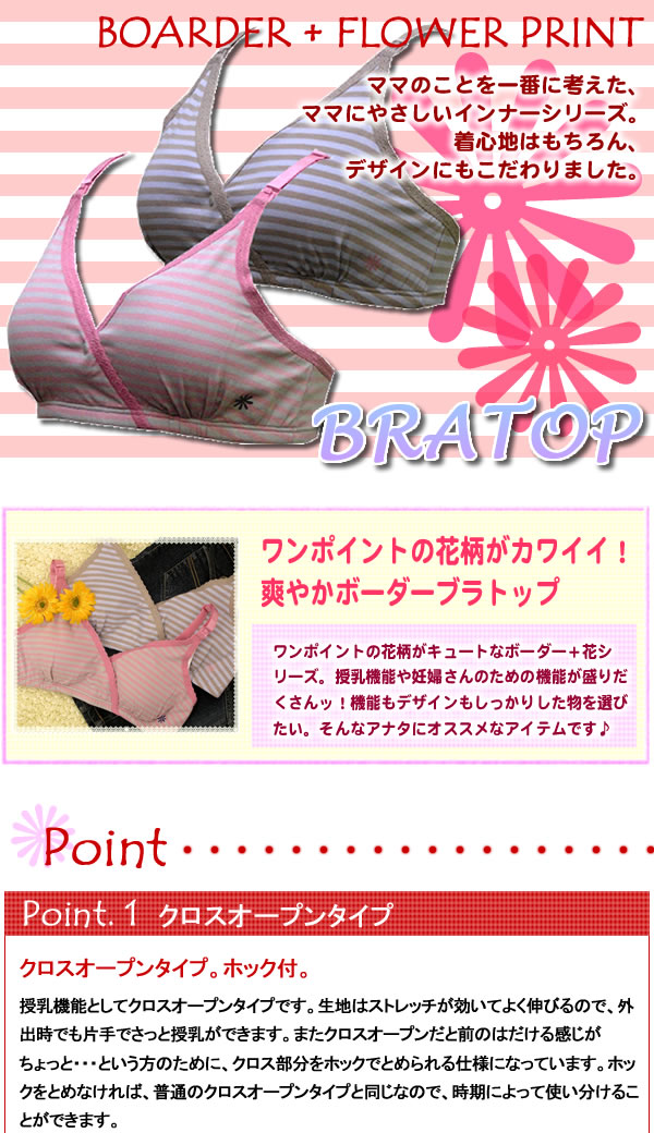 | ワンポイントの花柄がキュートなボーダー+花シリーズ。授乳機能や妊婦さんのための機能が盛りだくさん!機能もデザインもしっかりした物を選びたい。そんなアナタにオススメ! |