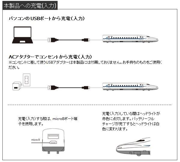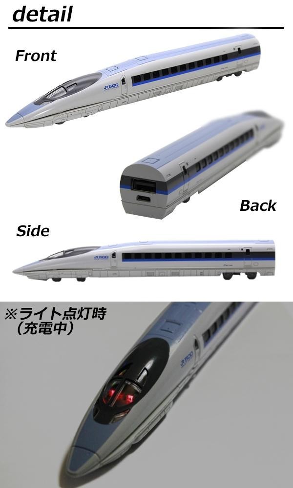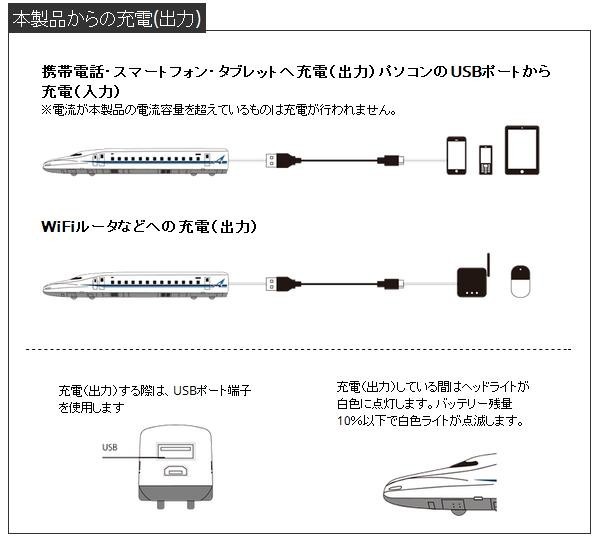 | 充電中は赤ライト、スマホや携帯に充電している時は白ライトといった細かい新幹線のライティングパターンを採用。持ちやすい新幹線を取り出したら周りの人の注目の的!!繰り返し約500回使用可能です。 |