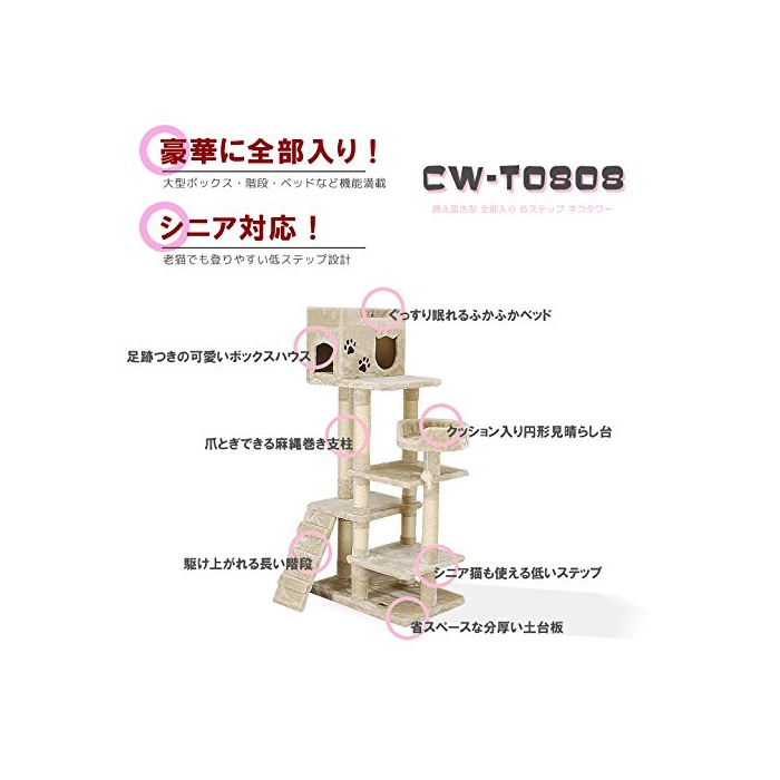 원본상품명:シニア運動苦手な猫さん向け 低段差で子猫も?? CW-T0808 146cm ネコタワ?キャットタワ?据え置き型 自立 【?になる?いが無いと好評です】もふもふ生地 1~3頭用 猫タワ? ペット用