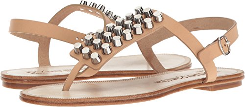 T-strap up through vamp embellished with silver-tone cylinder hardware.