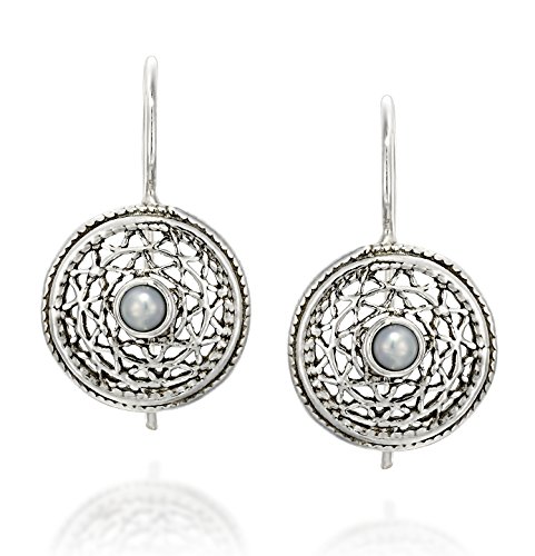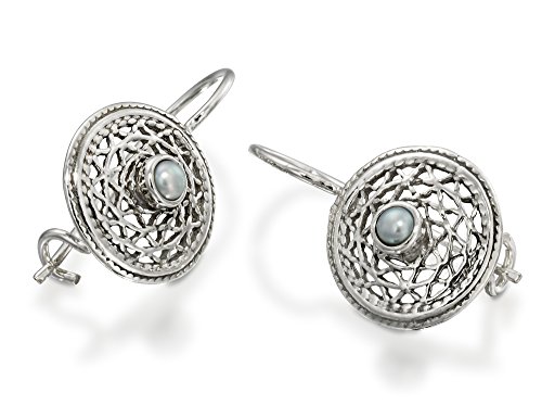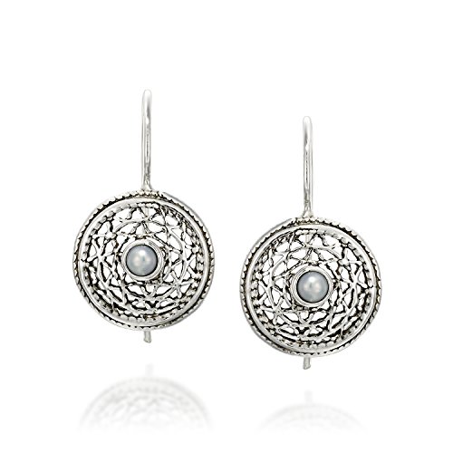 Elegant Sterling Silver and cultured Pearl filigree earrings with secure backs closure. 925 Sterling Silver round earrings with 3 mm white cultured Pearls. Unique artisan design.