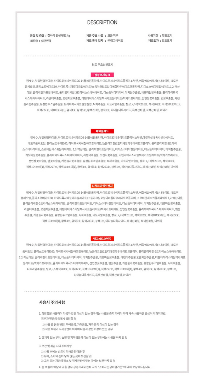 1. 화장품을 사용하여 다음과 같은 이상이 있는 경우에는 사용을 중지 하여야 하며 계속 사용하면 증상이 악화되므로 피부과 전문의 등에게 상담할 것