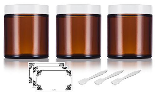 Includes 3- 4 oz Amber Thick Glass Straight Sided Jar with White Smooth Lids + 3 Spatulas & 3 Labels